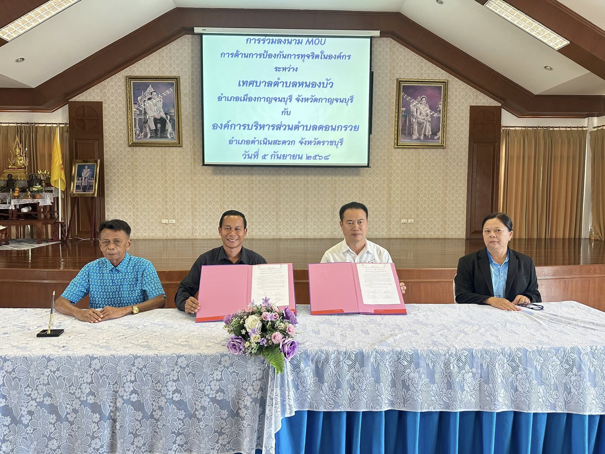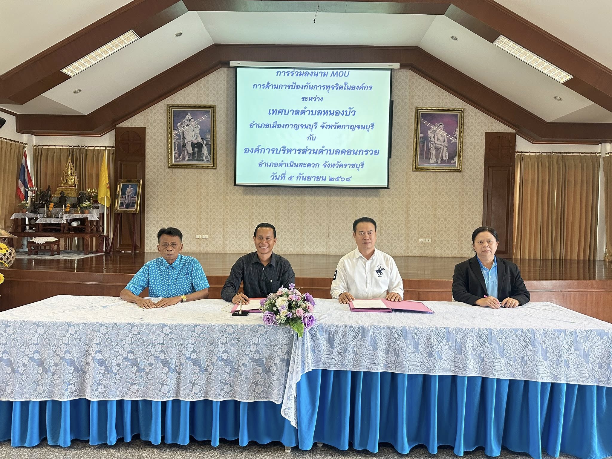 วันที่ 5 กันยายน 2568 จ.ส.อ.ปรีดา ทองใบ นายกเทศมนตรีตำบลหนองบัว พร้อมด้วยคณะผู้บริหาร คณะสมาชิกสภาเทศบาล และพนักงานเทศบาล ให้การต้อนรับคณะศึกษาดูงานจากองค์การบริหารส่วนตำบลดอนกรวย อำเภอดำเนินสะดวก จังหวัดราชบุรี ซึ่งนำโดยนายพัลลภ โฆสิตาภา นายก อบต.ดอนกรวย รับฟังการบรรยายแลกเปลี่ยนการเรียนรู้เกี่ยวกับการบริหารจัดการบ้านเมืองที่ดีภายใต้หลักธรรมาภิบาลของเทศบาลตำบลหนองบัว และร่วมลงนาม MOU การบริหารราชการด้วยความโปร่งใสเป็นธรรม